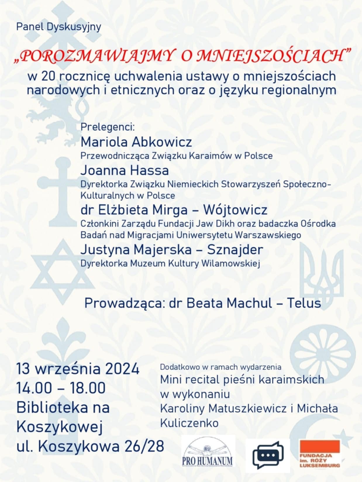 Panel dyskusyjny składa się z 10-minutowych wystąpień oraz moderowanej dyskusji. Zaproszone zostały przedstawicielki: mniejszości karaimskiej (najmniejszej liczebnie), niemieckiej (największej), romskiej (najbardziej wykluczanej społecznie) oraz społeczności wilamowskiej, która stara się o wpisanie do ustawy. Wykorzystają one swoją wiedzę oraz wieloletnie doświadczenie w działalności akademickiej, państwowej i pozarządowej, aby przedstawić różnorodne aspekty zachowania i rozwoju tożsamości kulturowej oraz ochrony praw mniejszości.